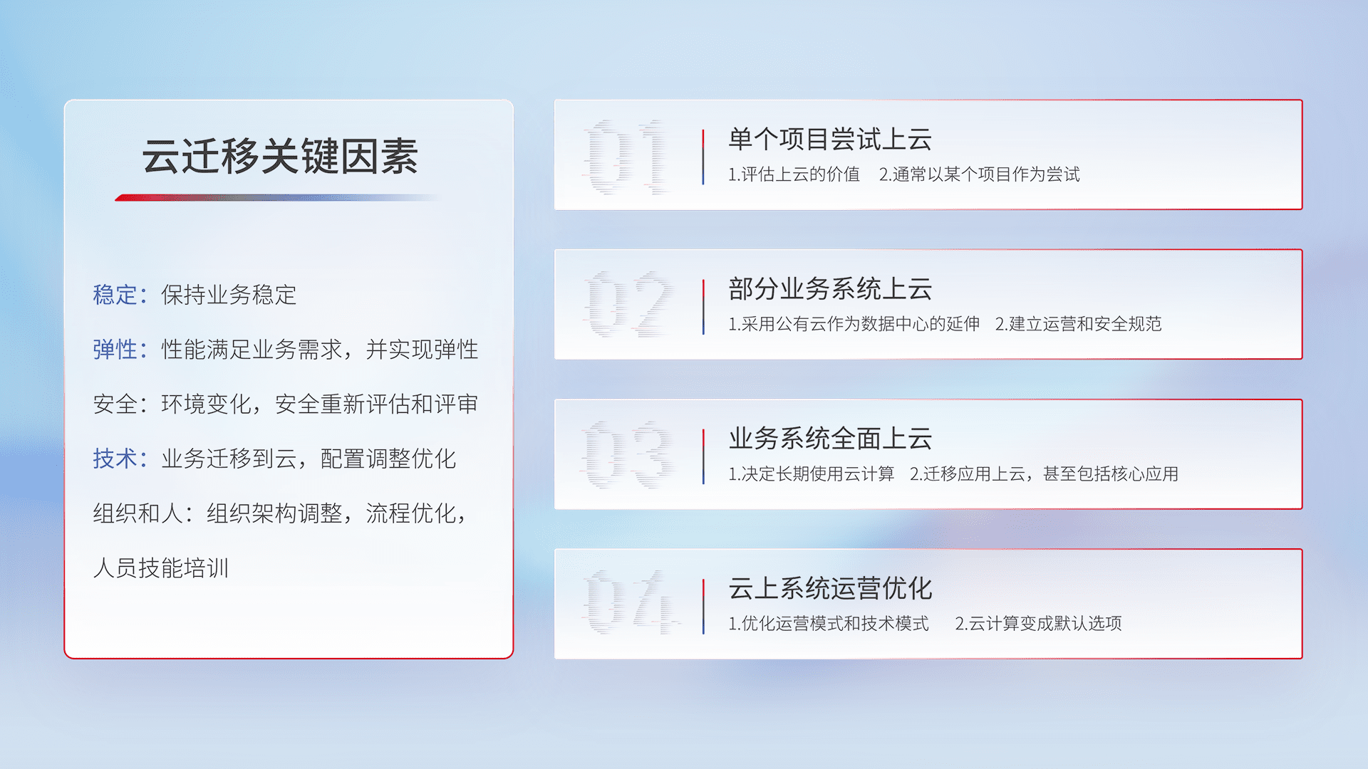 结合实际业务,,从规划设计、、、、云平台选型、、云原生改造、、、数据迁移、、集成交付,,迁移全过程为客户识别最佳上云路径,,,做好风险识别管理,,,设计网络架构、、、身份权限、、安全审计合规、、操作审计、、、日志审计、、监控告警策略、、多站点容灾设计等,,对云上基础设施进行整体规划,,,,提升IT治理水平,,以满足弹性、、、高可用、、、、高性能的需求。。