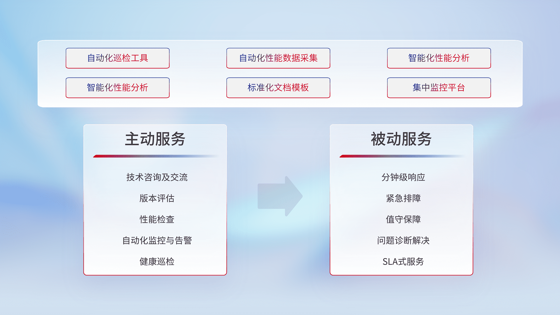 智能化工具和标准化文档,,,保障服务质量,,,提供主动服务(包含技术咨询、、、版本评估、、性能检查、、、、自动化监控与告警、、、健康巡检)和被动服务包含(分钟级响应、、紧急排障、、、、值守保障、、、、问题诊断解决、、、SLA服务)。。